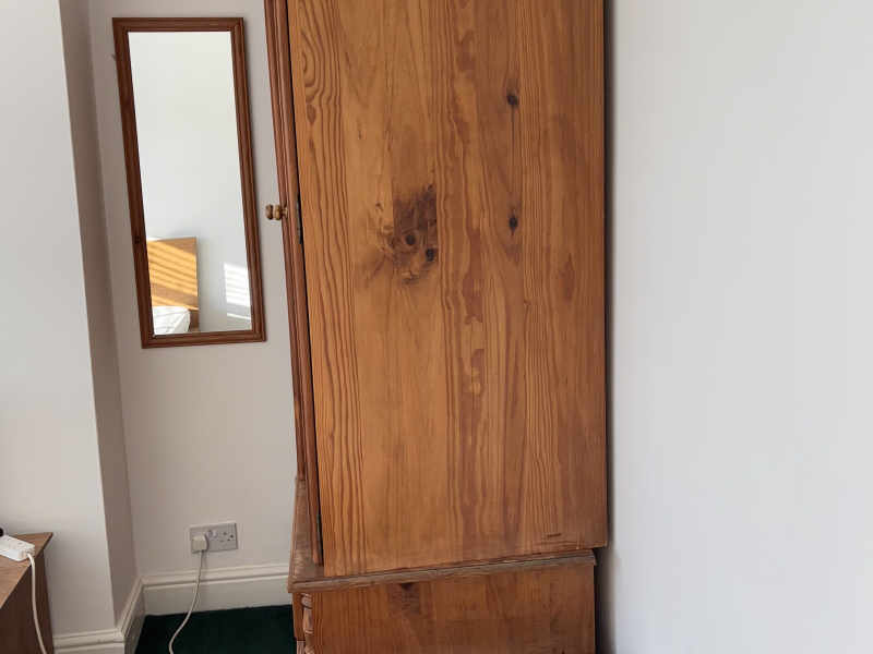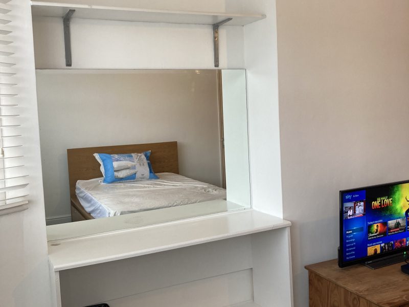This bedroom is fully furnished which includes a double wardrobe, drawers, wooden storage units, under bed storage drawers, and 2 wall mounted mirrors.