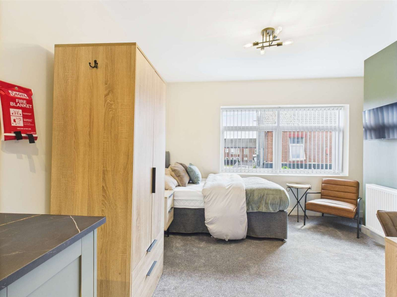 Room 3 offers a fresh, modern double bedroom within this newly developed professional home on West Street. The room is well laid out, allowing the double bed to sit comfortably without overwhelming the space, leaving practical walking room and a natural flow throughout.