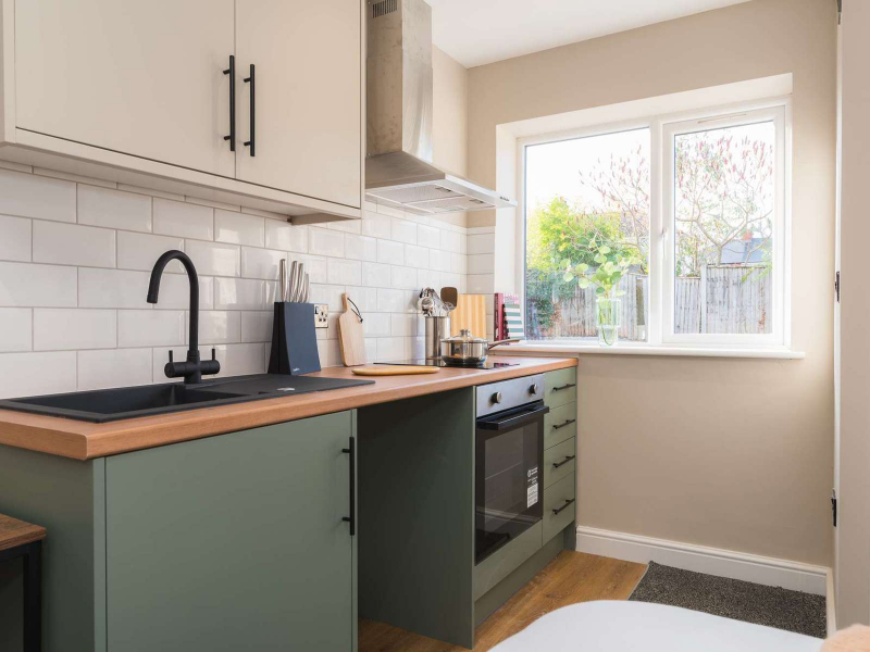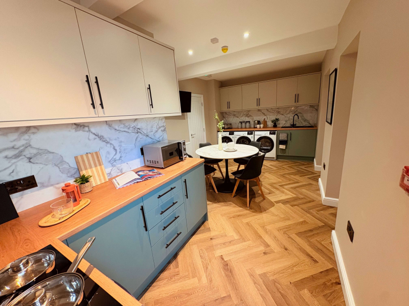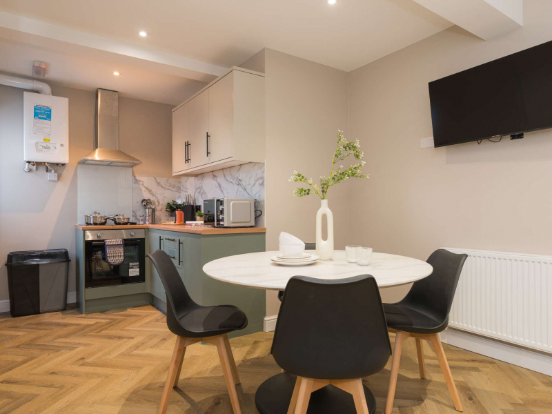 A beautiful brand new studio room featuring a modern kitchenette with fridge, oven and hob, as well as a spacious en-suite bathroom.