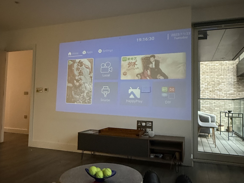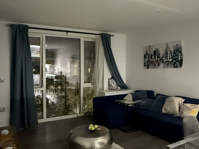 The flat has a contemporary open-plan layout with a sleek kitchen, dining area, and a cozy living room. There’s a projector for an at-home cinema experience, furnished with a plush blue sectional sofa and dining table. The bathroom is modern and well-kept, featuring both a shower and a bathtub.