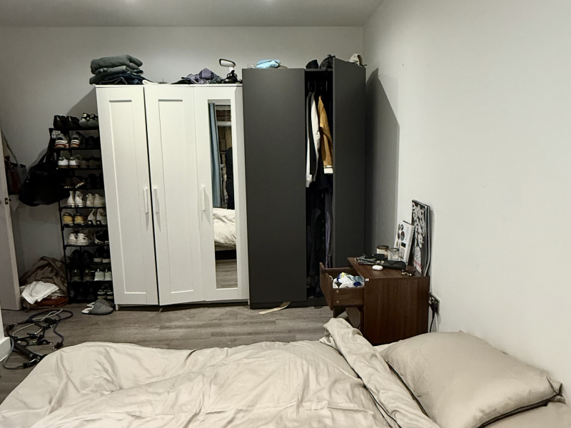 A spacious, fully furnished double room with a comfortable bed, large mirrored wardrobe, and chest of drawers. The room gets a good light and has a calm, inviting atmosphere. It’s facing a beautiful church (my favorite part)