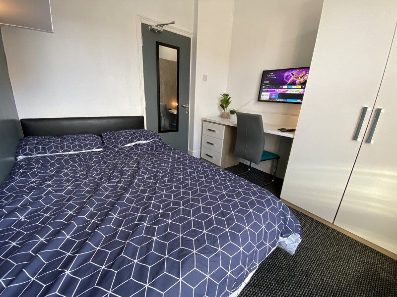 A spacious bedroom that comes fully furnished and carpeted with a double bed, wardrobe, bedside table, desk and chair.