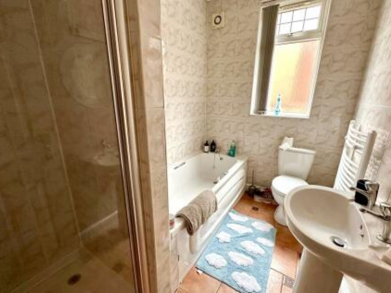 Bathroom comprises of bath with glass shower screen wc and handbasin.